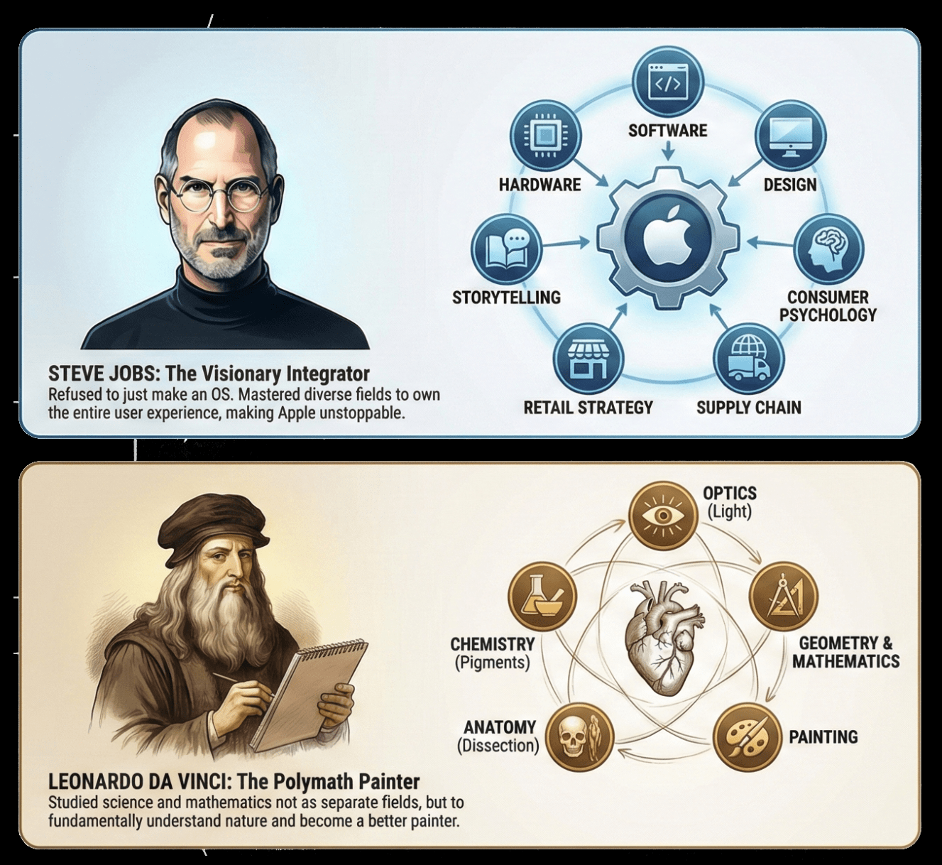 Steve Jobs didn’t just understand software. He mastered hardware, design, consumer psychology, supply chain, retail strategy, and storytelling. Not the best at any single thing, but the combination made Apple unstoppable. He refused to make just an operating system and let someone else build the computer. He wanted to own the entire experience.