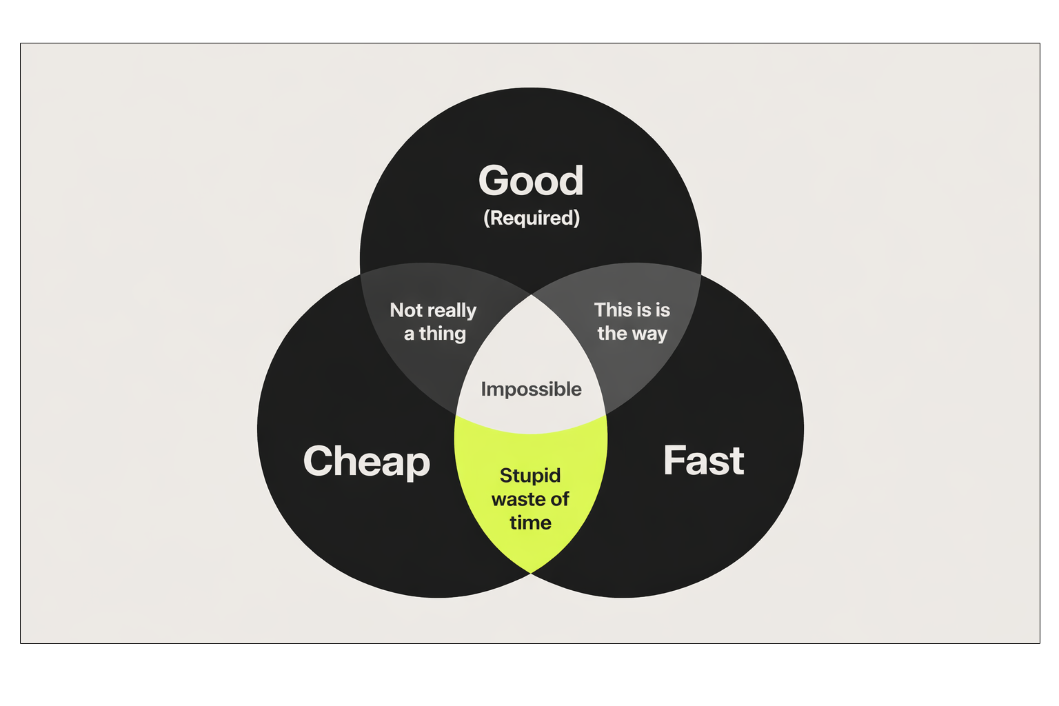 “You can’t have all three. If you want something done well and quickly, it’s going to be expensive. If you want it done well and affordably, it’s going to take time. And if you want it fast and cheap, well, don’t expect perfection.”